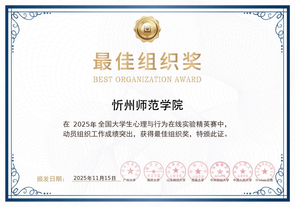 近日,第三届全国大学生心理与行为在线实验精英赛圆满落幕。我校凭借在赛事组织、选手选拔与指导中的突出工作,被大赛执委会授予“最佳组织奖”。