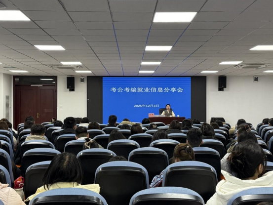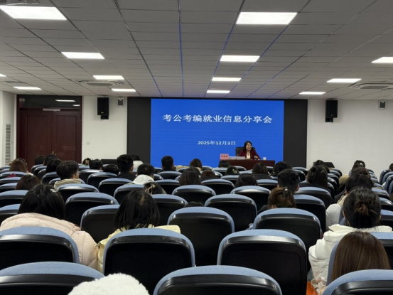 为帮助学生精准把握公务员及事业单位报考趋势,提升备考能力,我校学生工作部于12月3日晚特别邀请原中公教育考试研究院核心院长吴晓婷老师在行政楼二层小报告厅举办考公考编就业信息分享会,分享会由学工部副部长王琛主持,大三、大四学生参加此次会议。
