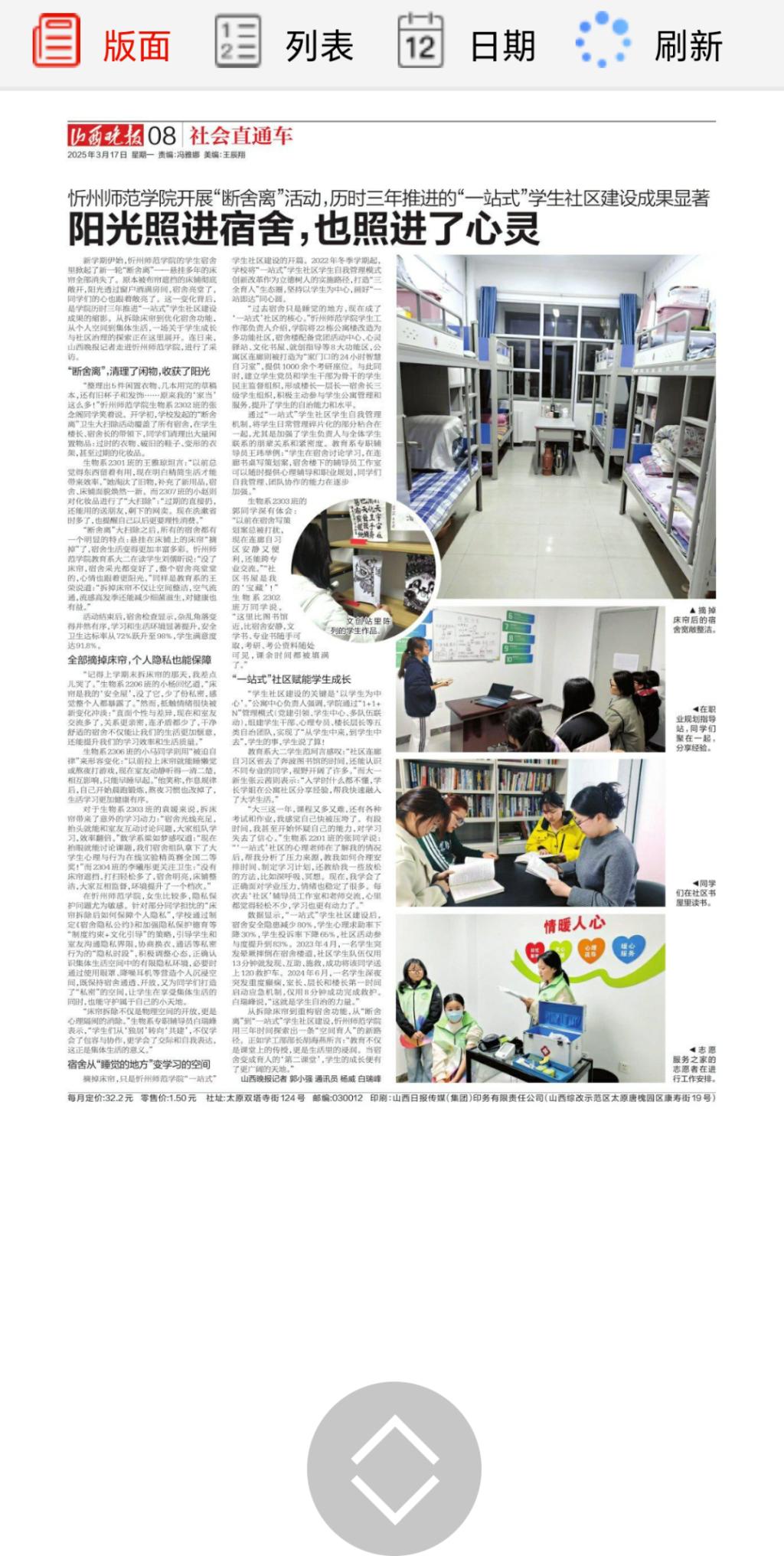 近日,《山西晚报》以《从“亮宿舍”到“育新人”解锁忻州师院“一站式”学生社区蝶变密码》为题,对我校“一站式”学生社区建设成果进行了第二次跟踪报道,全面展现了学校以学生为中心、深化育人模式改革的实践成效。