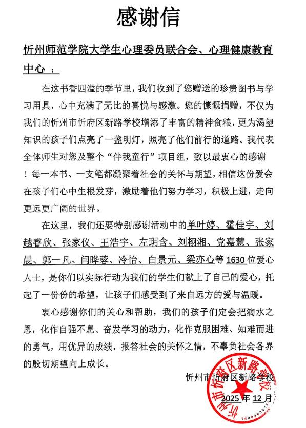 近日,我校收到忻州市忻府区新路学校发来的感谢信与受捐证明,信中字字真挚、句句暖心,既是对我校“心理绿洲,忻师共筑”公益主题活动的高度认可,更是爱心传递的温暖回响。