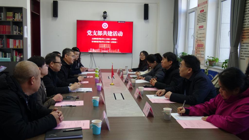 为深入学习贯彻习近平新时代中国特色社会主义思想,落实新时代党的建设总要求和新时代党的组织路线,推动校际党建与育人资源深度融合,1月8日上午,我校学生工作部(人民武装部)与太原师范学院学生工作部(人民武装部)在行政楼B104开展了党支部共建活动,两校学生工作部(人民武装部)党支部成员参加此次活动。活动分为座谈和参观两个环节,双方围绕党支部共建、学生工作提质增效等核心议题展开深度研讨。